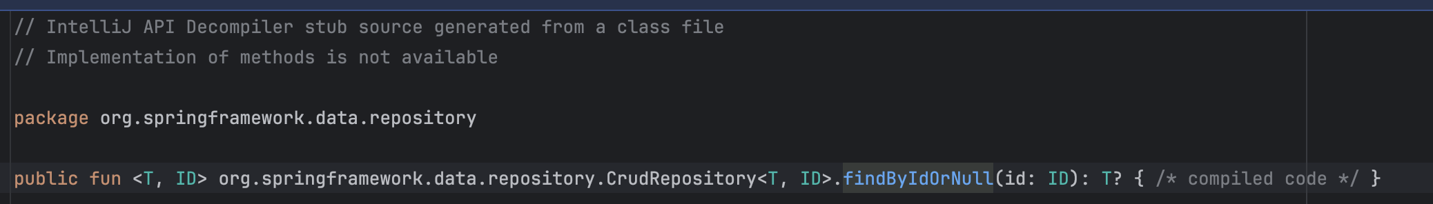 코틀린에서 반환 타입에 ? 를 붙이면 nullable 타입이 되고 findByIdOrNull 확장함수를 사용할 수 있어서 Optional을 사용하지 않아도 된다.