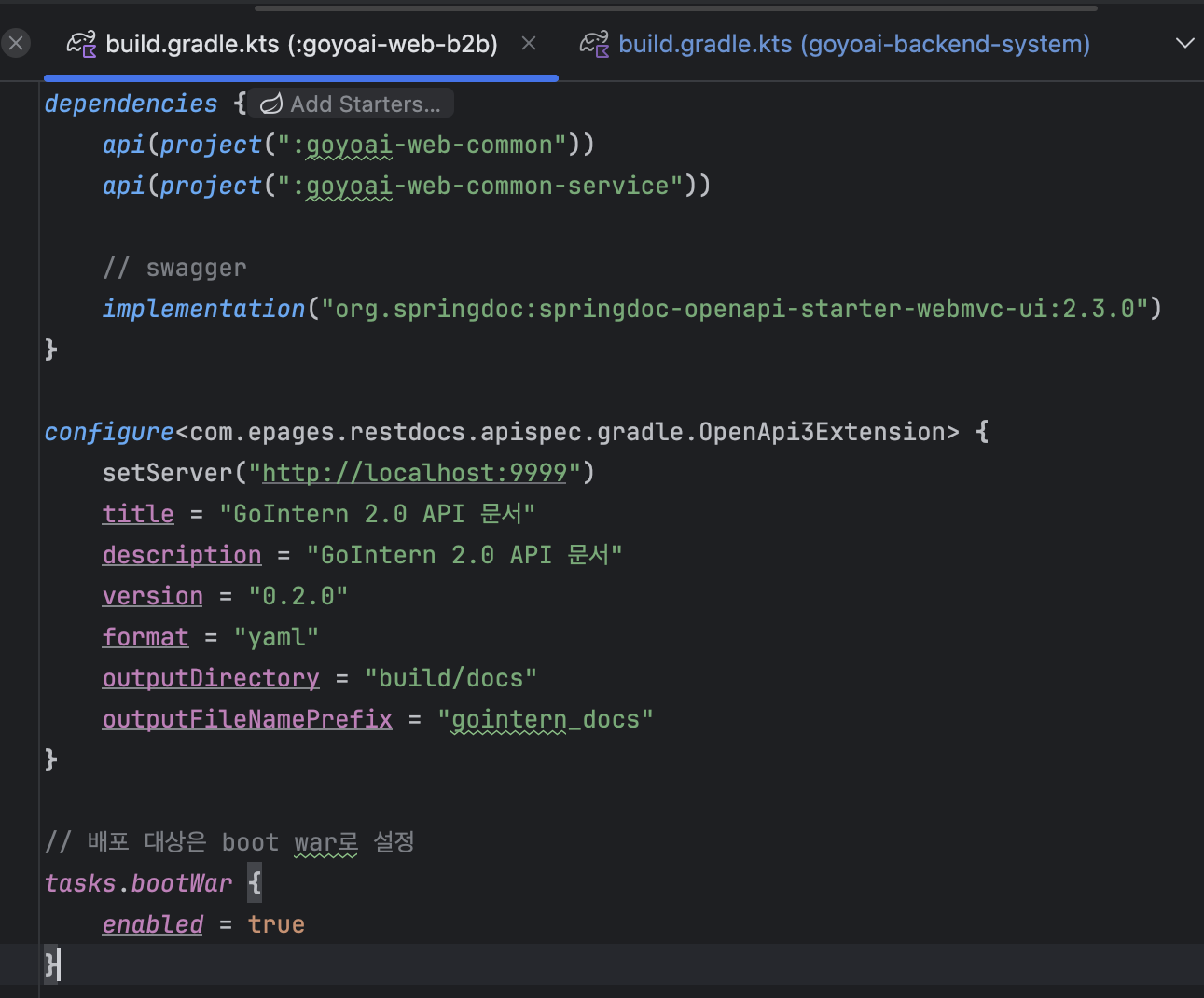 그리고 swagger같은 application 계층에서만 필요한 의존성들을 넣고 설정한다.