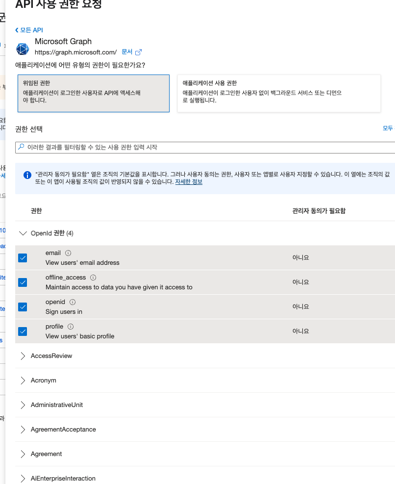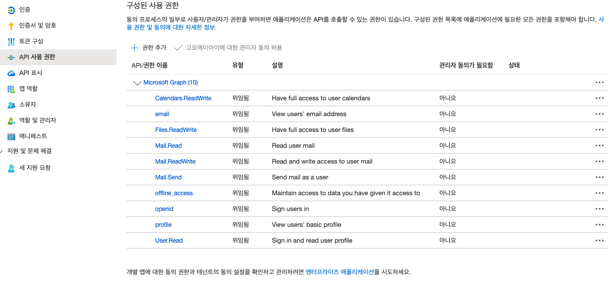 권한추가 > Microsoft Graph > 위임된 권한 에서 권한 선택 칸에서 검색하고 권한을 선택하고 추가하면된다.