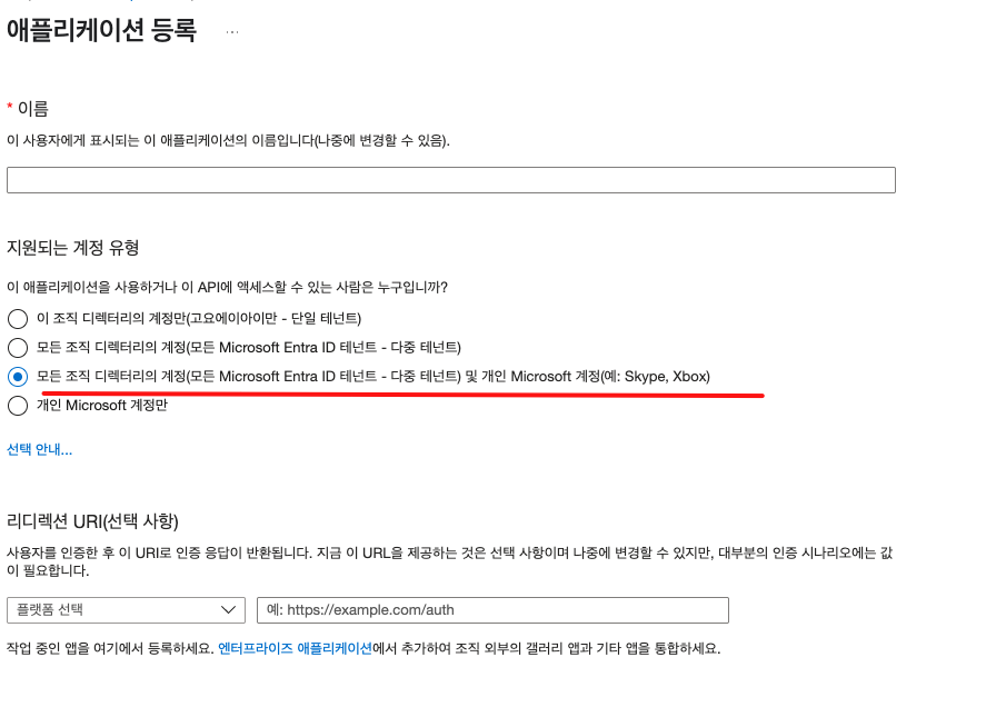앱 등록에서는 지원되는 계정 유형이 있다., 모든 조직계정과 개인계정이 사용될수 있도록 하려면 아래 3번째꺼를 선택하면된다.