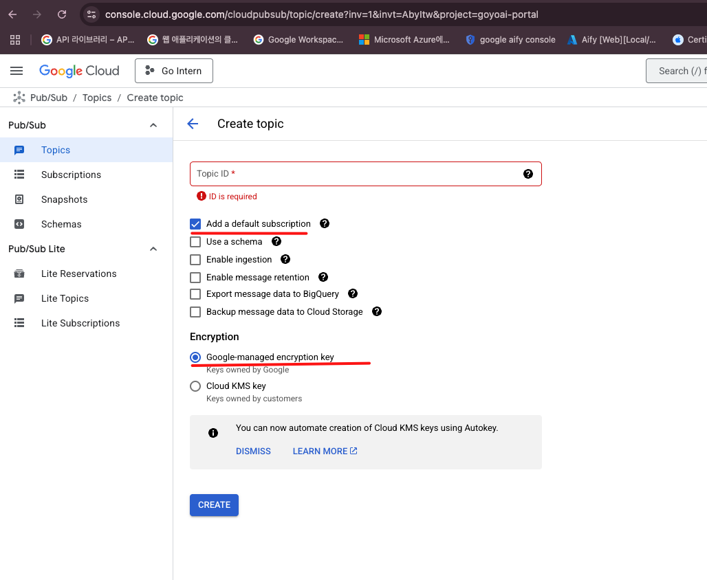 그리고 소스에서는 구글 sdk를 이용해서 WatchRequest()에 그 위에서만든 토픽 이름을 이용해서 watchRequest 객체를 만들고