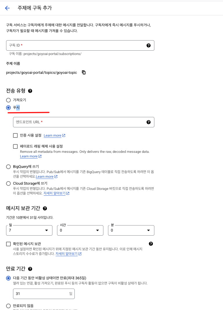 구독을 추가 하면된다. 전송유형은 push로 해서 알림을 받을 endpoint를 기입해주면 된다.